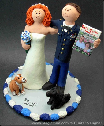 A wedding cake topper is a small model that sits on top of the wedding cake, normally a representation of the couple in formal wedding attire.